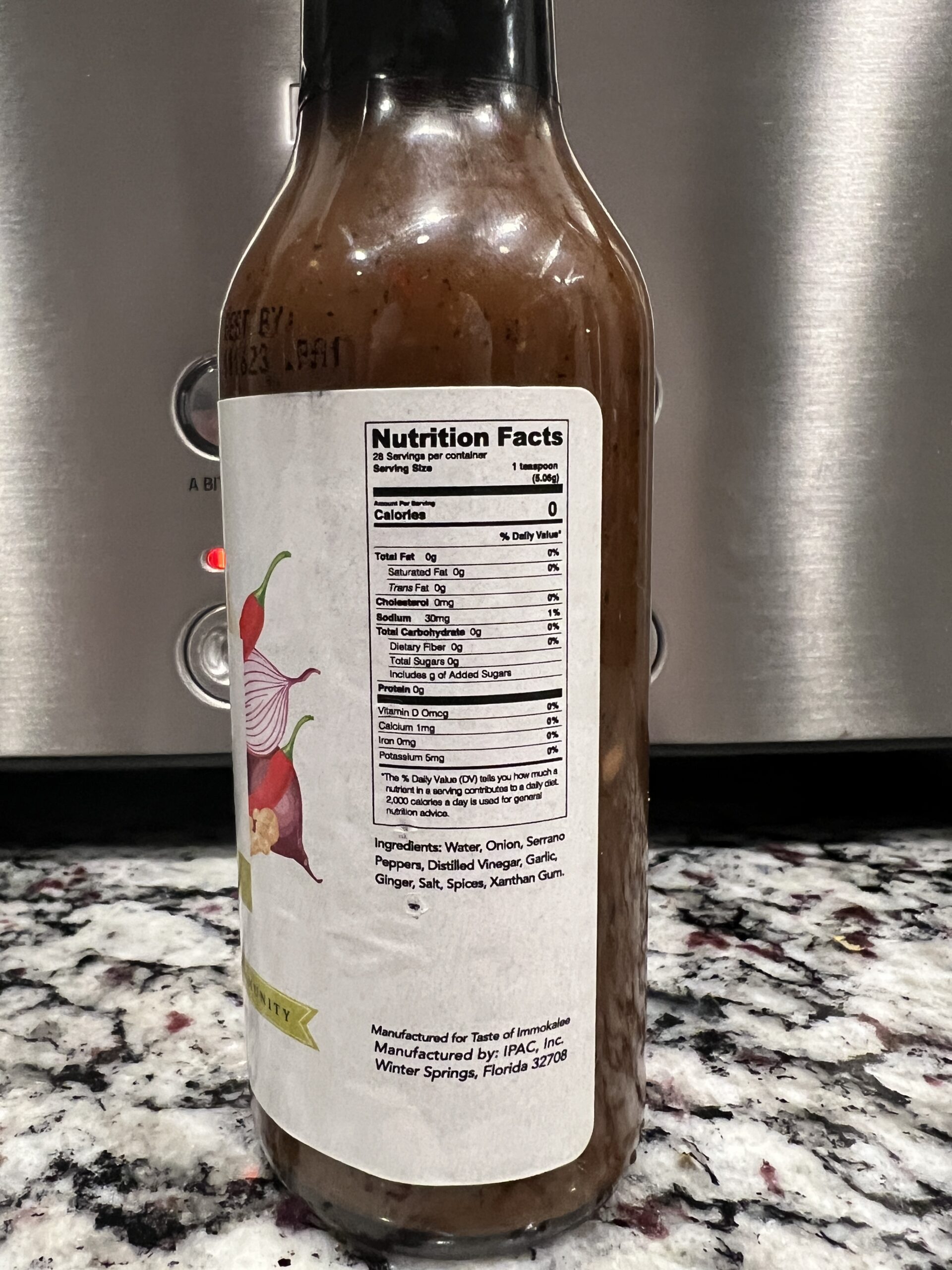 Ingredients: Water, Onion, Serrano Peppers, Distilled Vinegar, Garlic, Ginger, Salt, Spices, Xanthan Gum