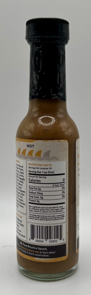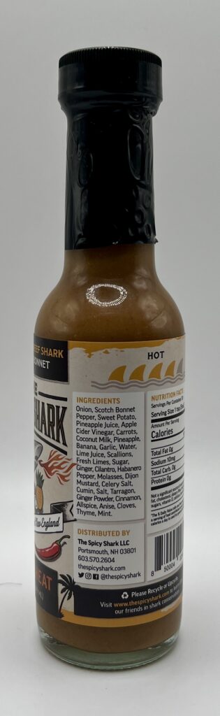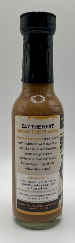 The Spicy Shark’s sauces tend to involve a large number of ingredients, many of them unexpected, and this sauce the Caribbean Reef Shark featuring the Scotch Bonnet is no exception. Scotch Bonnet peppers are often used in Caribbean style hot sauces. The style of those sauces can differ greatly from brand to brand – some are very piquant and mustard-forward, others feature just a fiery pepper dominated flavor profile, and yet others are much sweeter combining tropical fruits with peppers for a sweet and spicy blend. This sauce is an example of the latter type, and while it’s my least favorite of the three, I did find this particular sauce enjoyable.
