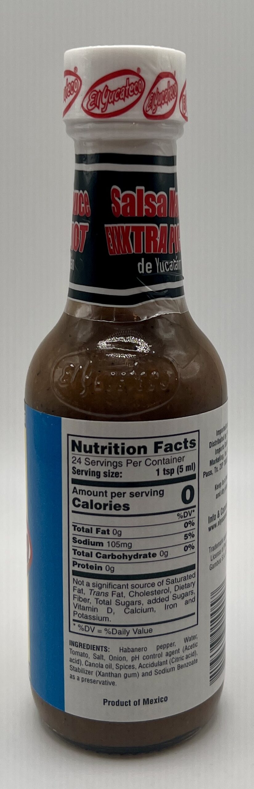 Ingredients: Habanero Pepper, Water, Tomato, Salt, Onion, pH Control Agent (Acetic Acid (vinegar)), Canola Oil, Spices, Acidulant (Citric Acid), Stabilizer (Xanthan Gum), and Sodium Benzoate as a preservative.