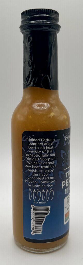 According to BBoVT these peppers naturally start to become spicier through successive generations so this sauce is released as a limited microbatch when their affiliated farms can grow enough of the pepper with virtually no heat. The Trinidad Perfume should top out at about 500 Scoville Heat Units, which makes it one of the mildest peppers out there, even milder than the Poblano pepper from which most people detect no real heat.