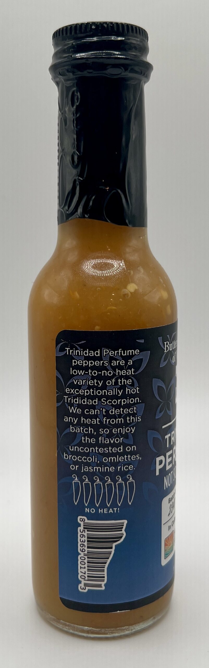 This is another unique single-varietal limited release sauce from Butterfly Bakery of Vermont. This features the Trinidad Perfume pepper, a variant of the Trinidad Scorpion pepper that has virtually no heat, but still retains the floral and fruity flavor associated with the Trinidad Scorpion.