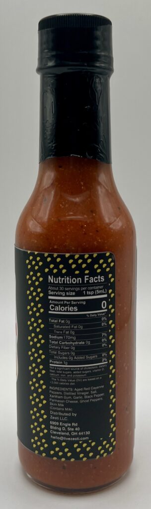 Ingredients: Aged Red Cayenne Peppers, Distilled Vinegar, Salt, Xanthan Gum, Garlic, Black Pepper, Parmesan Cheese, Ghost Peppers, Skim Milk (contains milk)