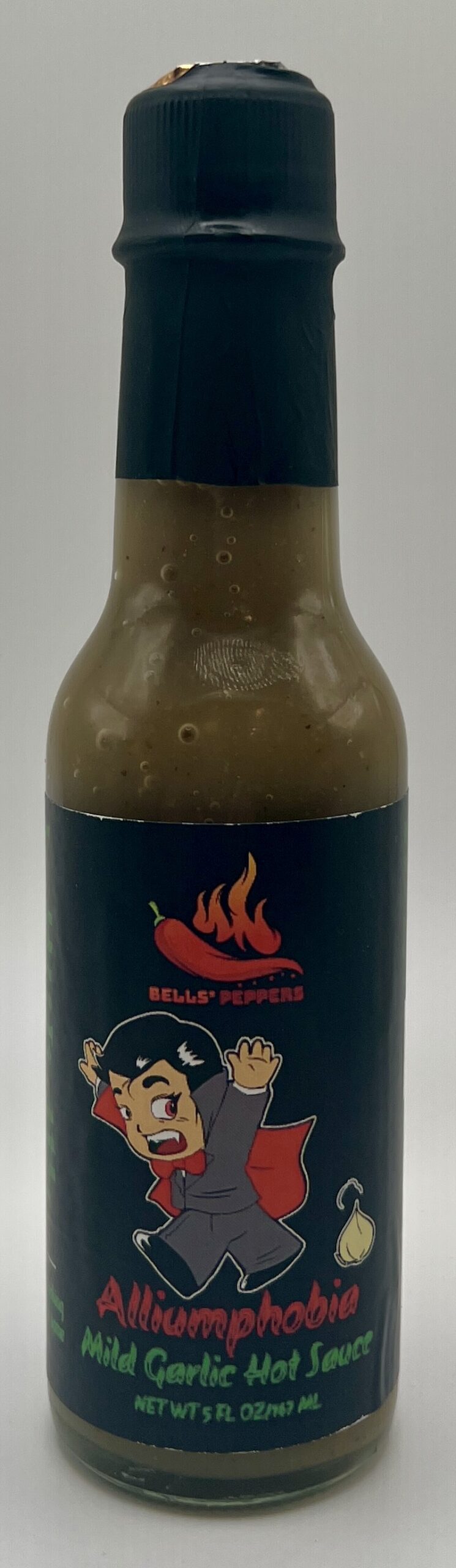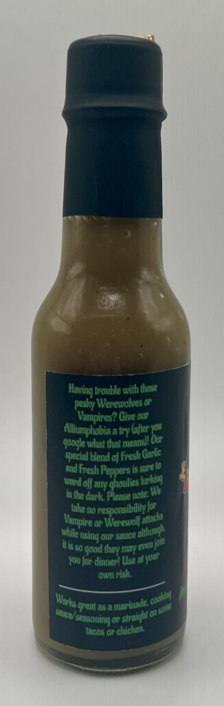 Sometimes I’ll see a sauce label that immediately grabs my attention and makes me interested in purchasing one or more sauces from that company. That was the case with Alliumphobia. I saw a post regarding in on Reddit and the cute little vampire running away from the garlic bulb grabbed my attention. When I looked into Bells’ Peppers I discovered that not only were they a small-batch craft hot sauce company, they were based within driving distance of my house (and in fact I believe they just had someone from their company deliver the box to my door instead of mailing it after I’d placed the order).