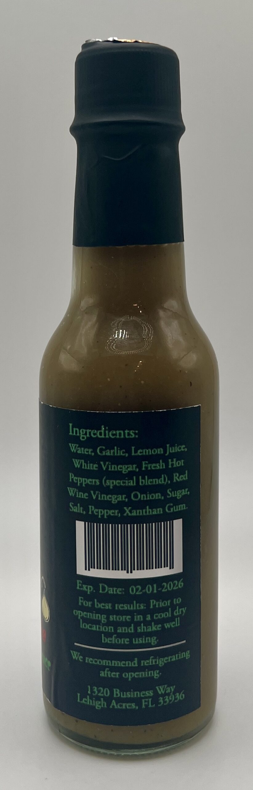 Ingredients: Water, Garlic, Lemon Juice, White Vinegar, Fresh Hot Peppers (special blend), Red Wine Vinegar, Onion, Sugar, Salt, Pepper, Xanthan Gum