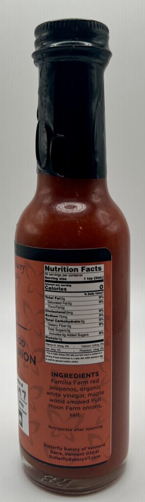 According to the bottle this sauce began as a one-off experiment but was so popular it eventually became a permanent fixture in the Butterfly Bakery of Vermont lineup. As with most of their sauces the ingredients list is simple in a way that belies the amount of flavor and complexity in the sauce. In this case just four ingredients – red jalapenos from Familia Farm, vinegar, maple wood smoked onions from Full Moon Farm, and salt. Smoking onions does more than just add a smoky flavor. Because onions have a high sugar content they caramelize easily, and the sulfur compounds in onions break down under heat which allows mellower and sweeter flavors to come forward.