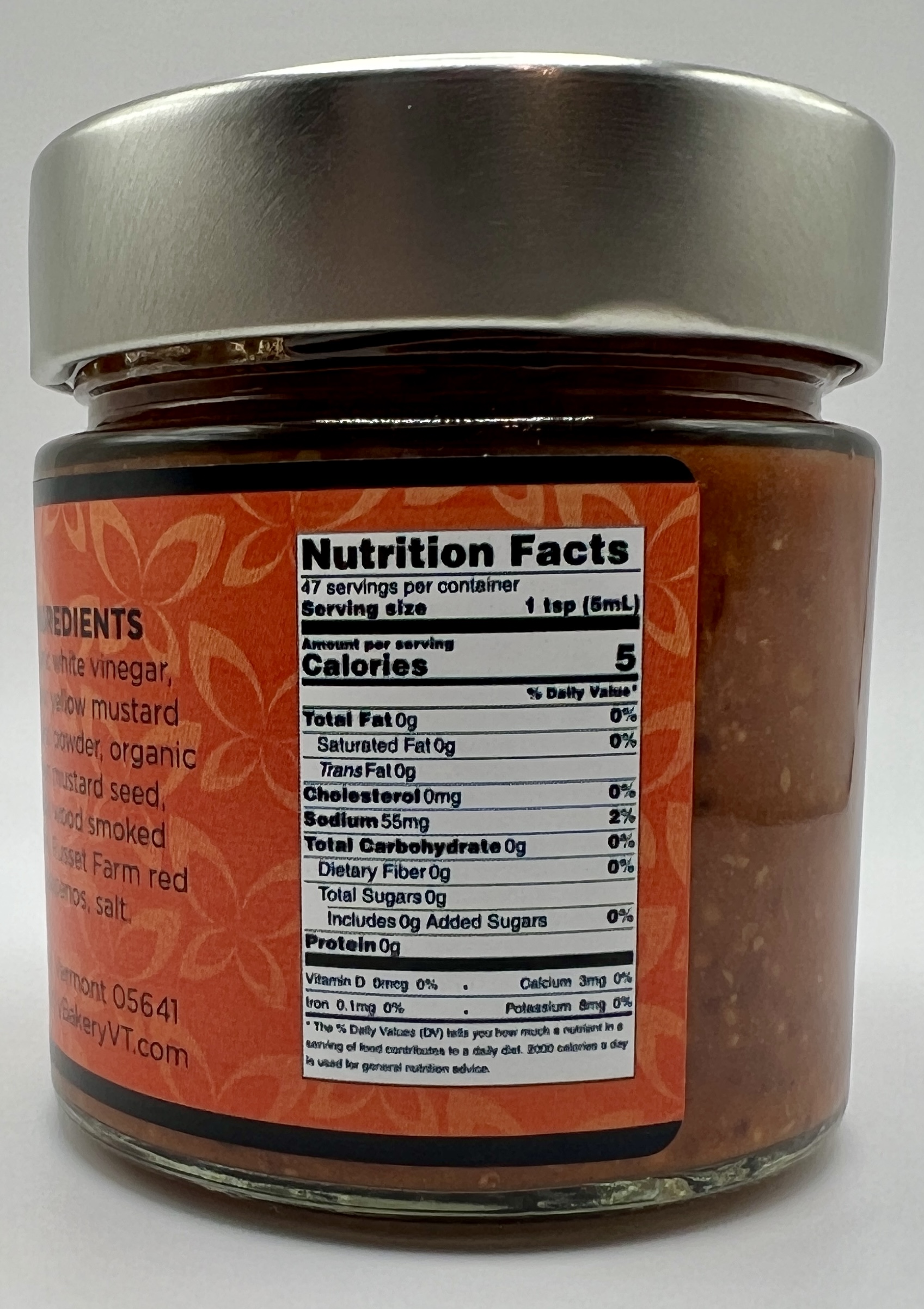 Ingredients: Organic white distilled vinegar, organic yellow mustard seed and powder, organic brown mustard seed, maple wood smoked Golden Russet Farm red jalapenos, salt