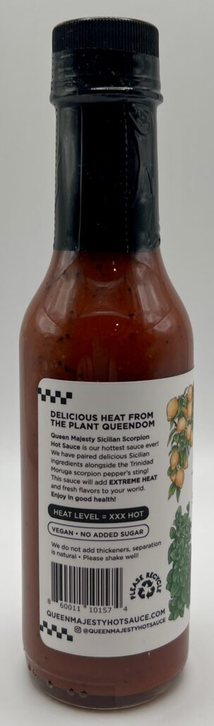 Sicilian Scorpion is the first hot sauce I’ve tried from Queens, NY’s Queen Majesty, a brand I’ve heard a lot about. Looking them up they’ve been operating since 2013, quite a while for a craft hot sauce brand, and pride themselves on making all natural sauces with no added sugar, preservatives, or xanthan gum, something I always love to see. Sicilian Scorpion is a new release that’s currently exclusive to Hot Ones for their new season 26 where it sits in the number nine position.