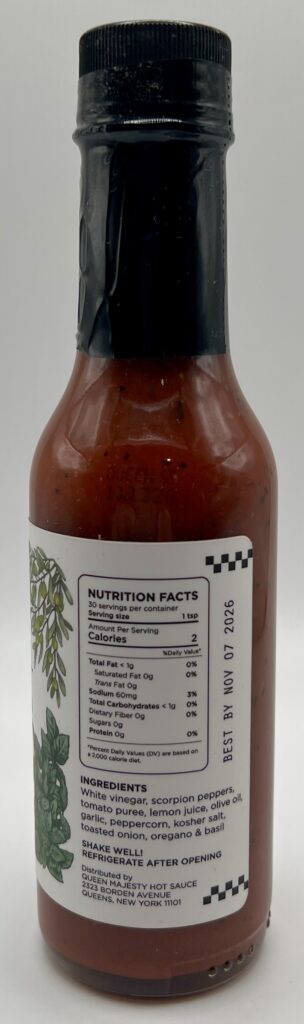 Queen Majesty’s commitment to clean ingredients is evident on their label. The goal of the sauce was to combine scorpion peppers with Sicilian inspired flavors, so in combination with the aforementioned peppers and vinegar there’s lemon juice, olive oil, garlic, peppercorns, onion, oregano, and basil. With vinegar being the first ingredient the sauce has a medium consistency that flows well and there are some pepper bits and a little bit of nice chunkiness present. The aroma is of pure scorpion peppers, you can tell this is going to be an extremely hot sauce just from a sniff.