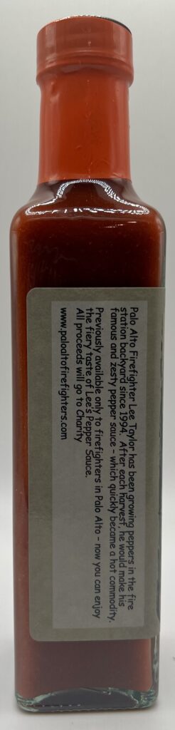 Originally created to find a way to deal with an overgrowth of peppers in the firehouse garden after a long vacation firefighter Lee Taylor created the recipe for his original pepper sauce in just an hour and received rave reviews from his fellows at the firehouse. The sauce evolved as Taylor replaced a charitable biking event he’d organized with crafting and selling his sauce, eventually growing to the point where the garden at his firehouse couldn’t keep up. While the sauce is now produced commercially nearby and the peppers are grown off-site the proceeds all still go to charity. Palo Alto Firefighters makes three versions of their sauce – the original which is jalapeno based, the XX Habanero, the subject of this review, and a XXX Ghost Pepper.
