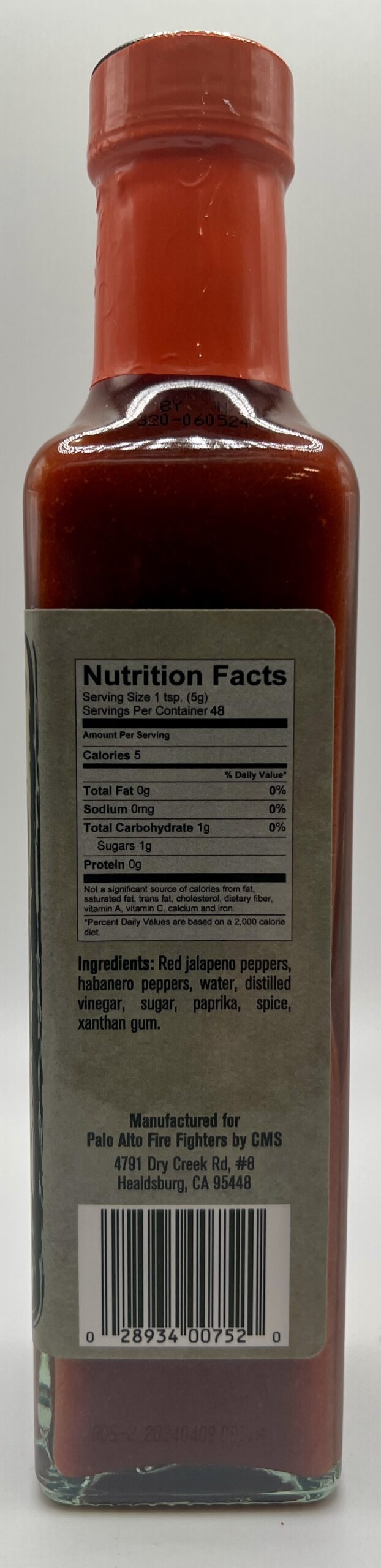 Ingredients: Red jalapeno peppers, habanero peppers, water, distilled vinegar, sugar, paprika, spice, xanthan gum