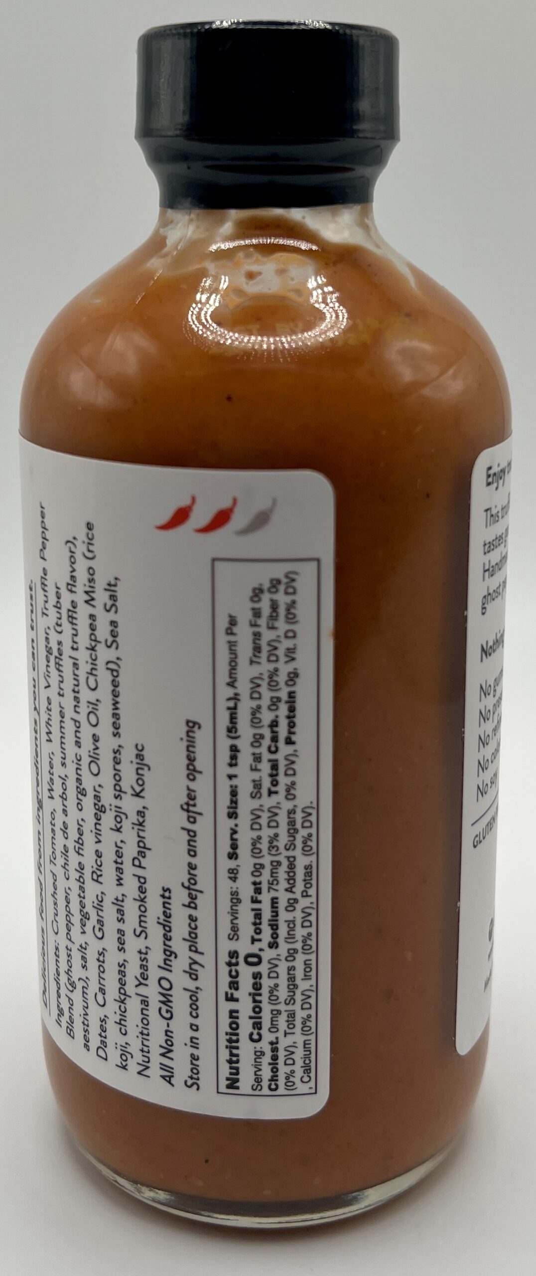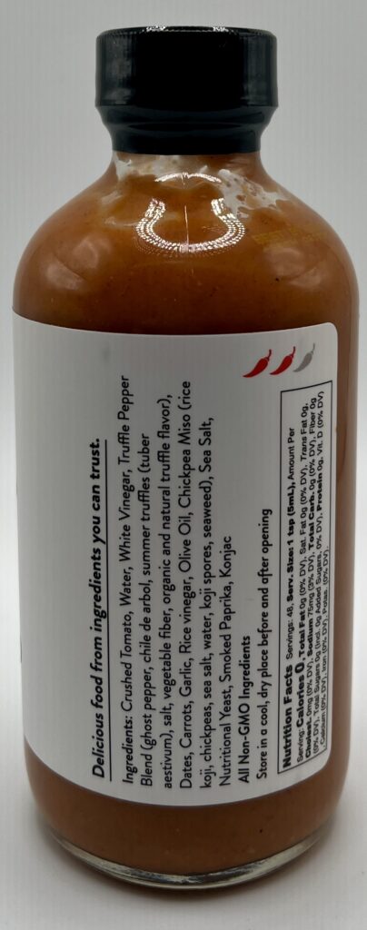 Ingredients: Crushed Tomato, Water, White Vinegar, Truffle Pepper Blend (ghost pepper, chile de arbol, summer truffles (tuber aestivum), salt, vegetable fiber, organic and natural truffle flavor), Dates, Carrots, Garlic, Rice Vinegar, Olive Oil, Chickpea Miso (rice koji, chickpeas, sea salt, water, koji spores, seaweed), Sea Salt, Nutritional Yeast, Smoked Paprika, Konjac