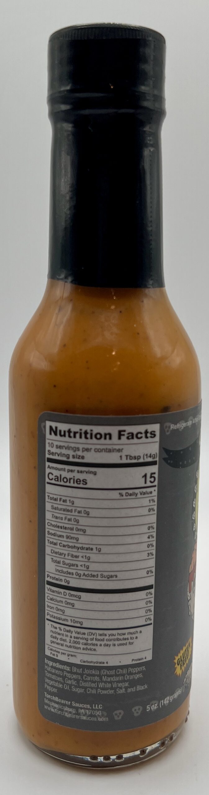 Ingredients: Bhut Jolokia (Ghost Chili) Peppers, Habanero Peppers, Carrots, Mandarin Oranges, Tomatoes, Garlic, Distilled White Vinegar, Vegetable Oil, Sugar, Chili Powder, Salt, and Black Pepper