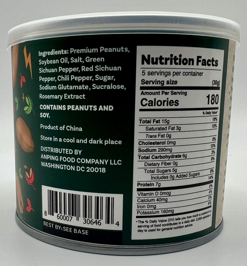 Ingredients: Premium Peanuts, Soybean Oil, Salt, Green Sichuan Peppercorns, Red Sichuan Peppercorns, Chili Pepper, Sugar, Sodium Glutamate, Sucralose, Rosemary Extract
