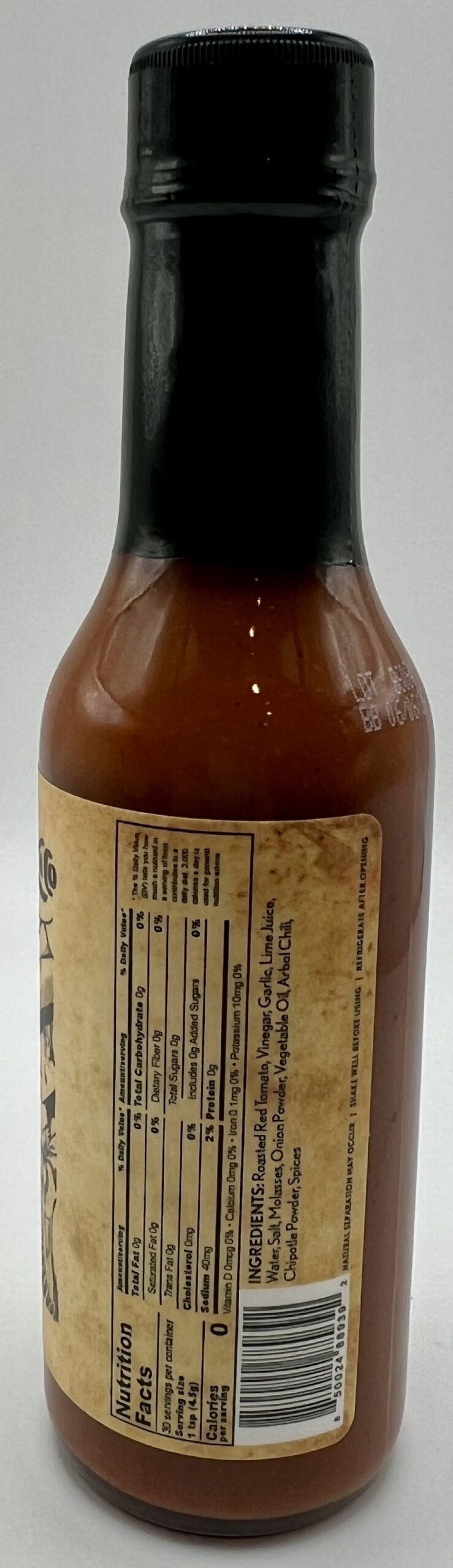 Ingredients: Roasted Red Tomato, Vinegar, Garlic, Lime Juice, Water, Salt Molasses, Onion Powder, Vegetable Oil, Arbol Chile, Chipotle Powder, Spices