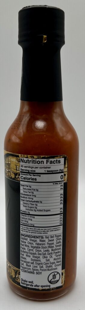 Ingredients: Red Bell Pepper, Distilled Vinegar, Water, Sweet Onion, Yellow Onion, Habanero Pepper, Garlic, Red Wine, Vegetable Stock (Water, Tomato Paste, Carrot, Onion, Leeks, Mushroom, Butternut Squash, Seat Salt, Garlic Powder), Red Wine Vinegar, Olive Oil, *Tamari (Water, Soybeans, Salt, Alcohol), Himalayan Salt, Organic Cane Sugar, Alaea Salt, Black Lava Salt, Shallot, Ground Peppercorn, Spices, Porcini Mushroom