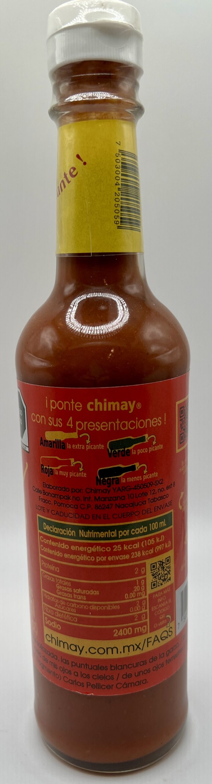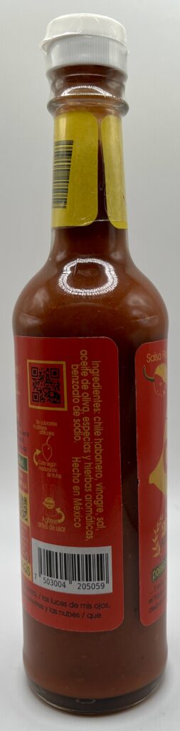 In terms of taste this one is a step milder than the Amarilla, so that answers the question about whether “extra picante” or “muy picante” is supposed to be hotter. At the same time the riper peppers used in this sauce have a bit more sweetness and are fruitier and more rounded in flavor than the ones in the Amarilla sauce. If you’re looking for more heat and bite the Amarilla sauce is for you, if you prefer a fuller flavor with more fruit and sweetness from the pepper and less vegetal flavor go for the Roja. Still trying to decipher the undisclosed herbs and spices used, and cilantro is definitely present, as is garlic and perhaps onion. If cumin is used it’s fairly subtle, though other Mexican herbs may be present as there’s a peculiar but pleasing savory flavor I can’t identify. This sauce is quite vinegar-forward and has some other sour elements that can make it a bit puckering, but the sweetness of the peppers and some earthy undertones balance that out.