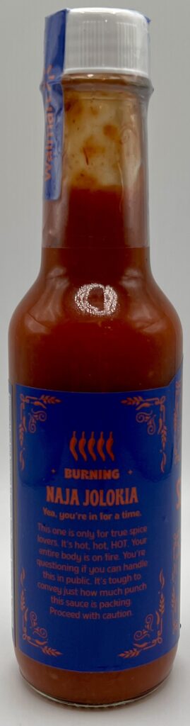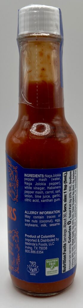 Ingredients: Naga Jolokia pepper mash (water, Naga Jolokia pepper), white vinegar, Habanero pepper mash, carrot, salt, onion, lime juice, garlic, citric acid, xanthan gum
