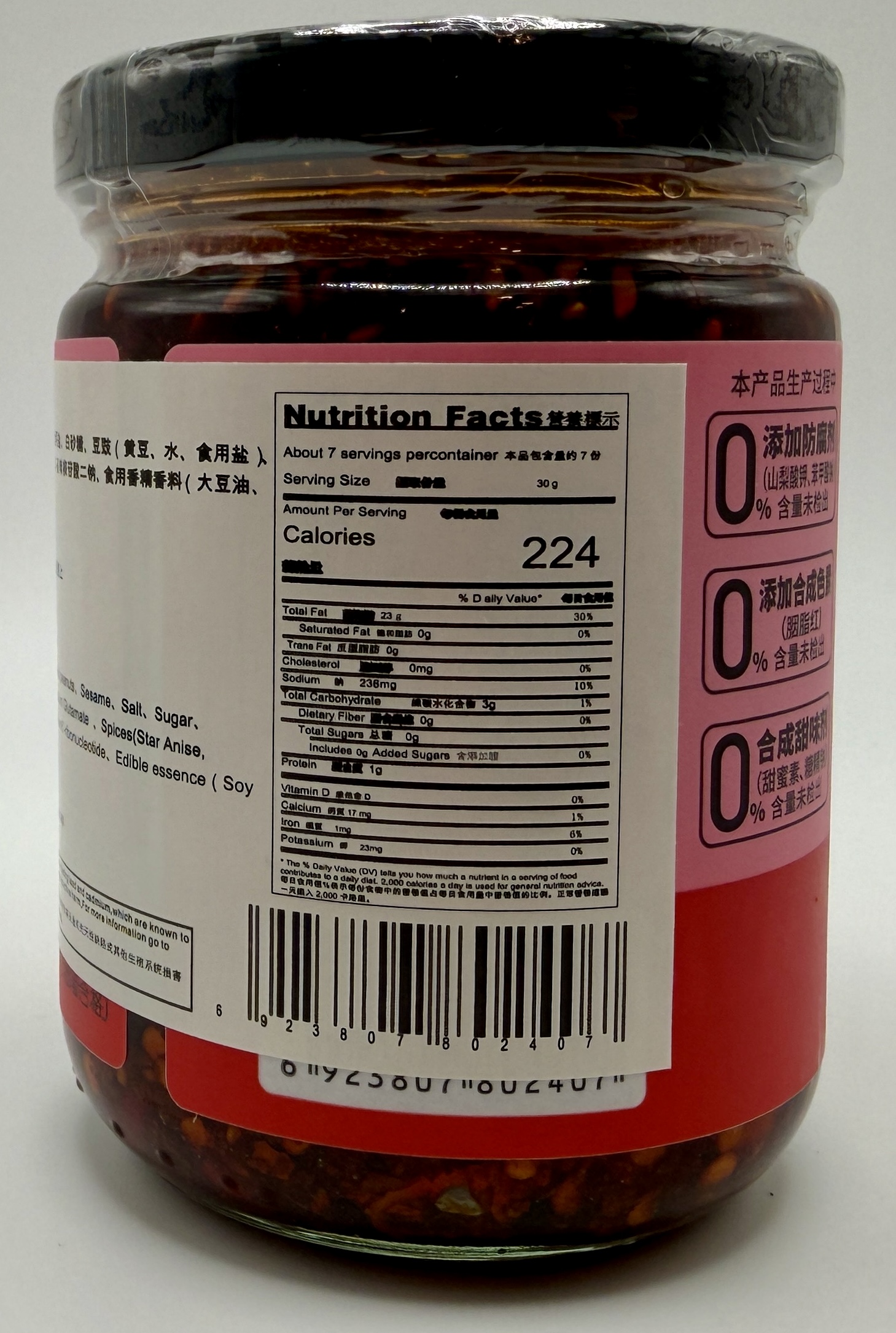 Ingredients: Soy oil, Chili, Peas, Roasted Peanuts, Sesame, Salt, Sugar, Tempeh (soya bean, water, salt), Monosodium Glutamate, Spices (Star Anise, Foeniculum Vulgare, Pepper), Paprika, disodium 5′-ribonucleotides, Edible essence (soy, oil, water, monosodium glutamate)