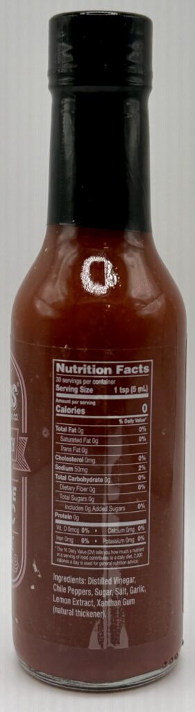 Ingredients: Distilled Vinegar, Chile Peppers, Sugar, Salt, Garlic, Lemon Extract, Xanthan Gum