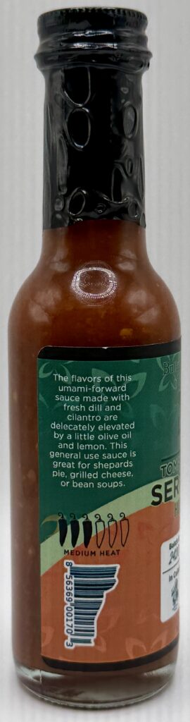 I remember thinking Hot House Hot Sauce tasted very fresh, almost like a farmer’s market stand pureed into a bottle, and Tomato Herb Serrano has that same vibe. While Hot House Hot Sauce was a bit too dill heavy for my taste the dill flavor is more balanced in this one. It’s still prominent but the tomato flavor comes through more, and I’m a big fam of tomato in hot sauces (and Butterfly Bakery of Vermont seems to source some great tomatoes) because of the natural tang and richness they can add. The cilantro also seems to come out more in this sauce which makes it taste extra fresh. There’s a great interplay between the vinegar, the natural acidity of the tomato, and the sour fresh flavor of the lemon juice that makes this sauce quite tangy but without tasting vinegar-heavy. The chile pepper flavors don’t hide in the background either, you can taste the fruit of the habanero and the juiciness of the serrano and carmen peppers with just enough of that vegetal flavor from those capsicum annuum peppers to add depth and contrast. Though there’s not much olive oil in this sauce – it’s not close to being emulsified for instance – what’s there both adds some richer mouthfeel and substance to the sauce and helps enhance the other flavors by carrying the fat soluble flavor elements forwards. Tomato Herb Serrano has a lot going on but I wouldn’t necessarily call it a “busy” sauce as the flavors do all meld very well. It’s summery, fresh, bright, tangy, rich, and complex without being complicated.
