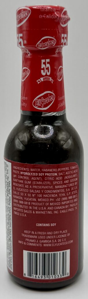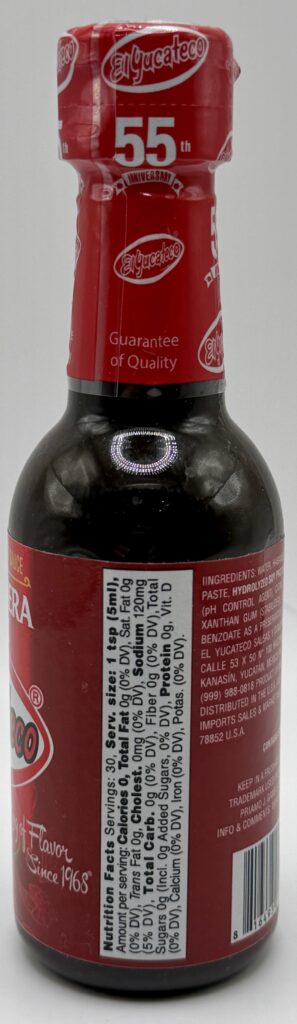This sauce is type of salsa negra, or black sauce, popular in regions of Mexico for pairing with seafood. Salsa negras typically incorporate various chile peppers as well as umami rich ingredients such as soy sauce, Worcestershire sauce, or Maggi seasoning. In this case we have habanero peppers, tomato paste, and hydrolyzed soy protein as the primary ingredients. Hydrolyzed soy protein is interesting as it’s a key ingredient in chemically produced soy sauces. There are essentially two ways to make soy sauce. The traditional method is to inoculate soybeans with aspergillus oryzae mold (koji) and then ferment it naturally over time, sometimes with wheat added as well. Over a period of months or years the koji mold will break down the soy and wheat proteins into amino acids that give soy sauce its depth of flavor and umami. The other method is acid hydrolysis. Defatted soy protein mash is treated with hydrochloric acid which quickly breaks it down into amino acids and is then neutralized with a base. Mix that with water, sugars, colors, and sometimes some MSG and you have soy sauce made in a day instead of months or years. Of course the flavor of chemically denatured soy protein can’t compare with the naturally brewed stuff, but in this case I will give El Yucateco somewhat of a pass as Maggi seasoning, which is also a popular addition to these kinds of sauces, is made the same way but with wheat instead of soy. Add some vinegar, xanthan gum, preservatives, and spices and you have a sauce that has a relatively short ingredients list. It’s very smooth in texture and has the semi-gel-like consistency common with sauces made with xanthan gum. The aroma is rich and has smoky notes as well as the soy and pepper aromas.