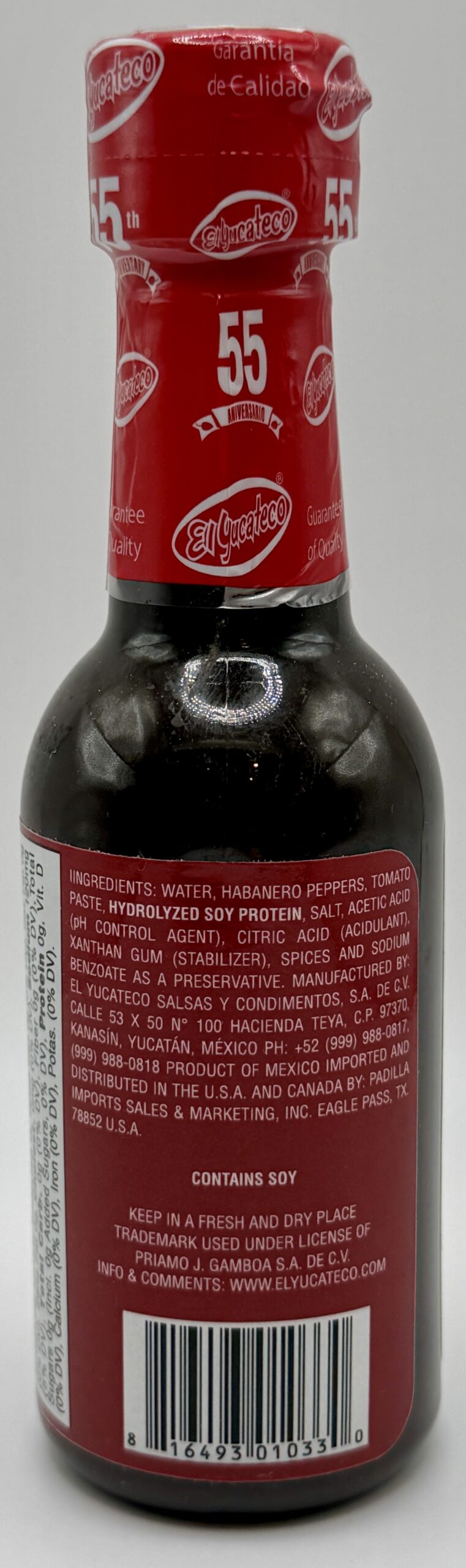 Ingredients: Water, Habanero Peppers, Tomato Paste, Hydrolyzed Soy Protein, Salt, Acetic Acid (pH control agent), Citric Acid (acidulant), Xanthan Gum (stabilizer), Spices and Sodium Benzoate as a preservative.