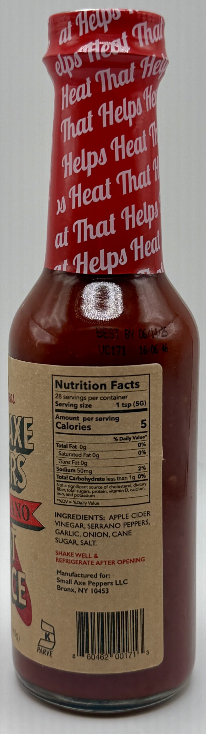 Ingredients: Apple Cider Vinegar, Serrano Peppers, Garlic, Onion, Cane Sugar, Salt