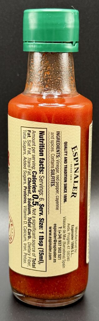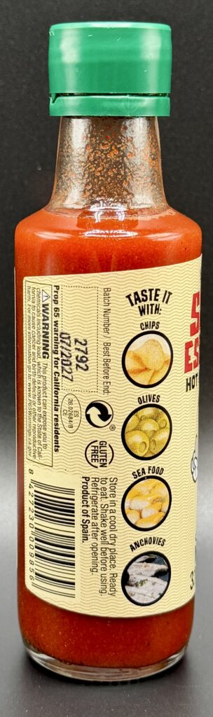 The ingredients list is simple in this sauce but doesn’t go into a lot of detail about many of them. The first ingredient is vinegar but it’s not listed as to which type. Based on the flavor of this sauce it doesn’t appear to be basic distilled white vinegar, and in fact it has hints of almost a malt vinegar. According to their website they use only “the finest selection of vinegars” in the sauce and being Spain I know that sherry vinegar is quite popular as are other wine vinegars, so it’s likely one of those. The next ingredient of “red peppers” again doesn’t go into the type. In Spain the most common variety are Piquillo, a sweet pepper with an extremely mild heat level. Cayenne pepper comes next and is what separates this “hot appetizer sauce” from their basic sauce. The final ingredient of “spices” also doesn’t disclose much but I can taste black pepper in the sauce and I believe there’s some paprika as well, another popular Spanish ingredient for color and some subtle smokiness. Salsa Espinaler is very thin and smooth in texture, similar to Tabasco sauce. The aroma is tangy but more complex than that of typical Louisiana style hot sauces.