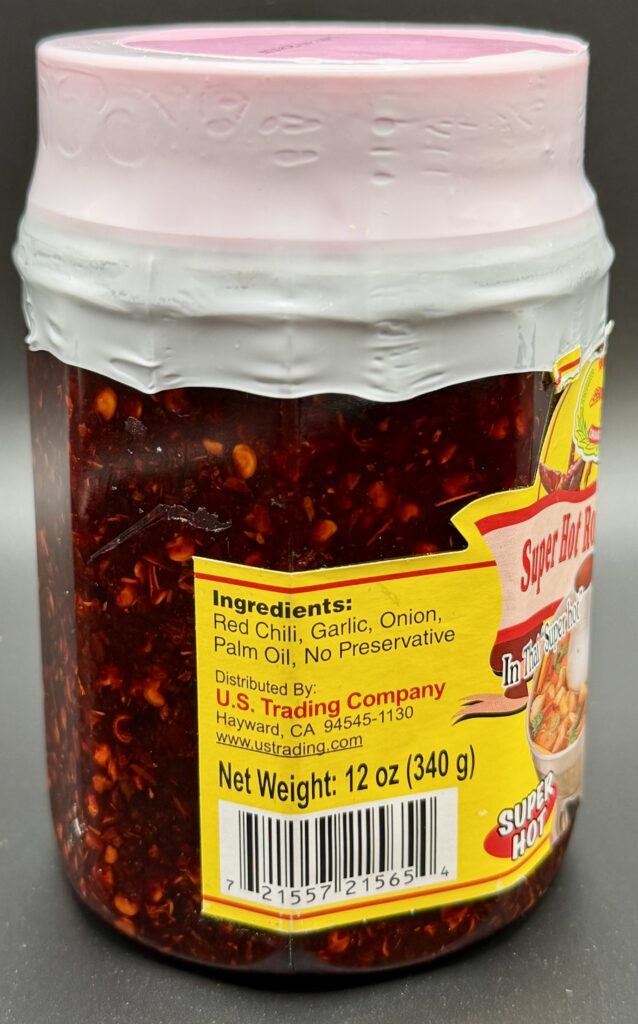 As compared to Chinese style chili crisps the Dragonfly Brand Super Hot Chili Oil has a simple and paired-down ingredients list. Known as Prik Nam Mun in Thailand it’s typically made of just Thai chili flakes, garlic, and shallots or onions with hot oil poured over them. Sometimes Thai seasoning sauce such as Golden Mountain, a soy sauce like product that also includes added MSG and other umami enhancers, is also added. In this case Dragonfly decided to go all natural with only chilis, onion, garlic, and oil. The oil they choice to go with is palm oil which has two interesting effects. On the positive side palm oil is particularly viscous which is good for a chili oil. In China the authentic oil of choice for chili crisp is called Caiziyou which is a cold-pressed unfiltered rapeseed oil that’s much thicker and with more body and flavor than western Canola oil which comes from the same plant but which is highly processed. That extra body from Caiziyou and palm oil means that the chili oils coat noodles and rice much more effectively – think how much more difficult it is to get motor oil off of your hands compared to olive for for example. The other less desirably effect is that palm oil solidifies much more readily than other oils and this turns as hard as a rock when refrigerated and takes quite some time to loosen back up. Visually the oil is deep red and this has lots of crunchy chili bits inside. The aroma is of chilis with some hints of the garlic and onion.